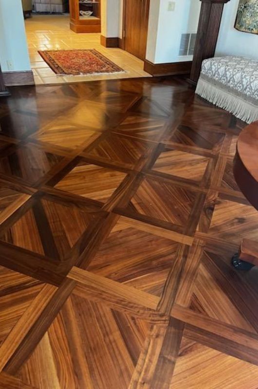 Rich walnut parquet in a block pattern, with varied tones and precise geometry that showcase both the wood’s character and the craftsman’s skill.