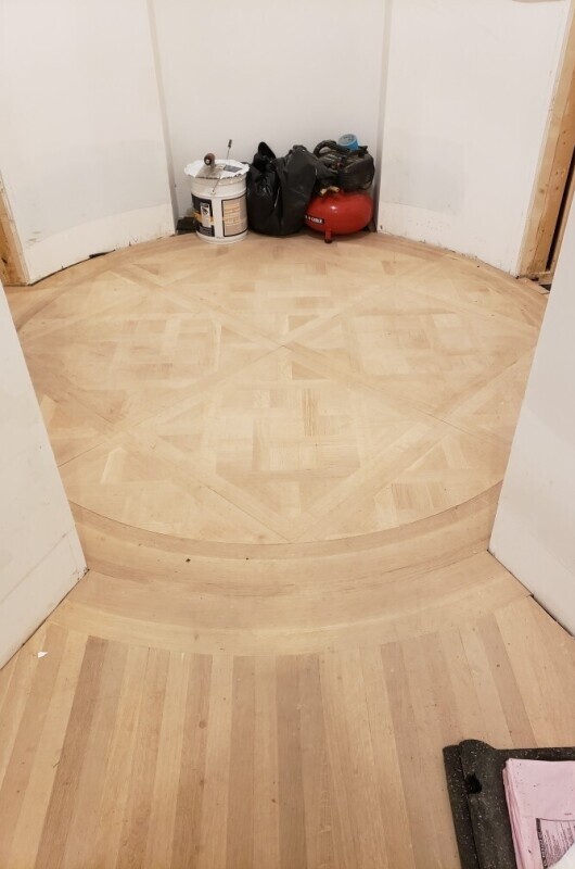 An unfinished circular parquet inlay, precise even before sanding and finishing.