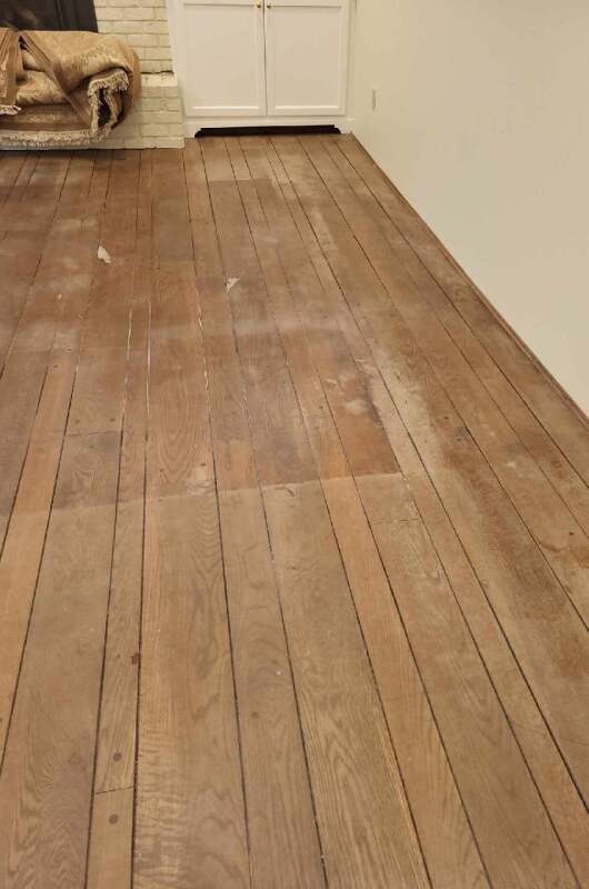 Before Refinishing – Worn Oak A floor with decades of wear, faded finish, and surface scratches captured prior to refinishing.